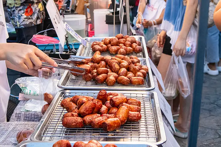 Sai ua is a delicious grilled sausage from Chiang Mai made with minced pork and a unique mix of herbs and spices, including garlic, shallot, lemongrass, kaffir lime leaves, and dried chili. The meaty sausage is cooked over a charcoal grill, giving it a bold and smoky flavor.