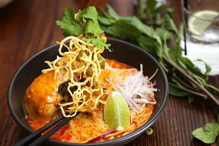 This creamy, curry-based noodle soup is a northern Thai specialty and the most famous food in Chiang Mai. Khao soi consists of soft egg noodles in a rich yellow curry and coconut milk broth, topped with crispy fried noodles, lime, pickled mustard greens, and your choice of chicken, beef, or tofu.